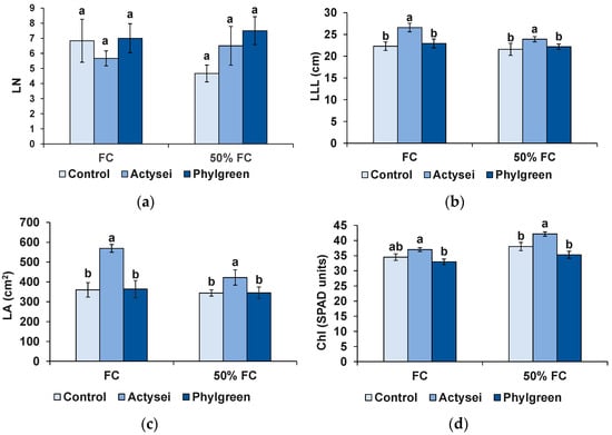 Foliar parameters after 12 weeks of the indicated treatments: (a) leaf number (LN); (b) length of the longest leaf (LLL); (c) leaf area (LA); (d) chlorophyll content (Chl) in SPAD units. Bars represent means with SD (n = 6). Different lowercase letters over the bars indicate significant differences between treatments according to the Tukey test (p < 0.05), at field capacity (FC) or 50% field capacity (50% FC).
