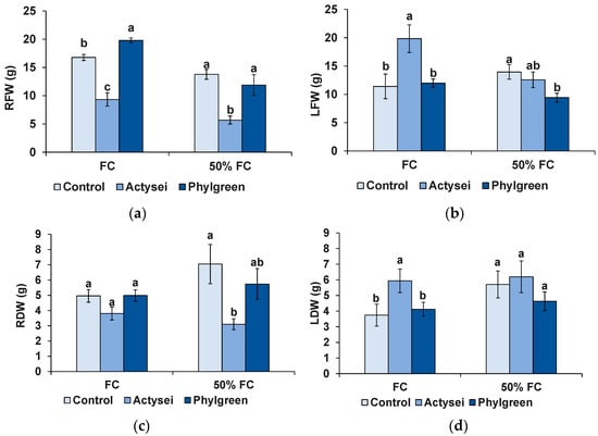 Biomass of plants after 12 weeks of the indicated treatments: (a) root fresh weight (RFW); (b) leaf fresh weight (LFW); (c) root dry weight (RDW); (d) leaf dry weight (RDW). Bars represent means with SD (n = 6). Different lowercase letters over the bars indicate significant differences between treatments according to the Tukey test (p < 0.05), at field capacity (FC) or 50% field capacity (50% FC).