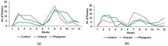 Total weekly production of flowers during the 12 weeks of plants from the indicated treatments: (a) plants watered at field capacity; (b) plants watered to half of the field capacity.