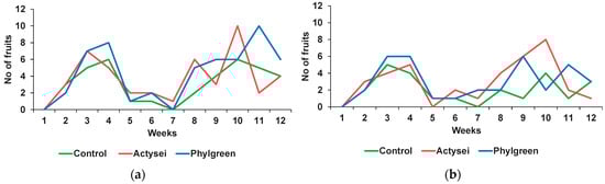 The same trend of fruit production was observed in plants watered at half the field capacity, again with two separate phases, the first with a peak by the fourth week and the second by the 10th week, with almost no fruit formation during weeks 5 to 7. The highest number of fruits was registered in the 10th week, with AcyseiTM-treated plants doubling the fruit production in control (Figure 4b).