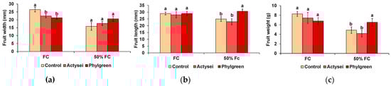 Morphological evaluation of the sampled fruits after 12 weeks of the indicated treatments: (a) Fruit width; (b) fruit length; (c) fruit fresh weight (bars represent means with SD (n = 20). Different lowercase letters over the bars indicate significant differences between treatments according to the Tukey test (p < 0.05) at field capacity (FC) and 50% field capacity (50% FC).
