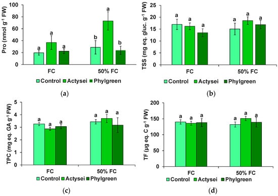 Biochemical evaluation of the sampled fruits after 12 weeks of the indicated treatments: (a) proline (Pro); (b) total soluble sugars (TSS); (c) total phenolic compounds (TPC); (d) total flavonoids. Bars represent means with SD (n = 10). Different lowercase letters over the bars indicate significant differences between treatments according to the Tukey test (p < 0.05) at the field capacity and 50% field capacity.
