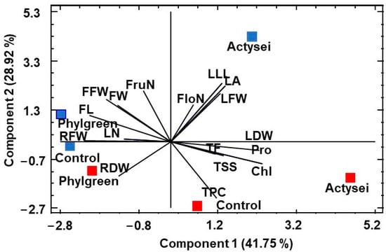 Correlation coefficients between morphological and biochemical traits and the two first principal components of strawberry plants treated with two biostimulants (ActyseiTM and Phylgreen®) and without biostimulant treatment, grown during 12 weeks at field capacity and 50% field capacity. Abbreviations: Number of leaves (LN); length of the longest leaf (LLL); leaf area (LA); chlorophyll content (Chl); root fresh weight (RFW); root dry weight (RDW); leaf fresh weight (LFW); leaf dry weight (LDW); number of flowers (FloN); number of fruits (FruN), fruit width (FW); fruit length (FL); fruit fresh weight (FFW); proline (Pro); total soluble sugars (TSS); total phenolic compounds (TPC); total flavonoids (TF).
