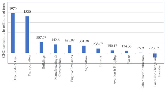 United States GHG emissions in 2019 by sector measured in CO2-eq (source: Our World in Data).
