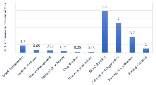 GHG emissions can be classified into several sectors. Some of these sectors include energy, industry, buildings, transportation, and, lastly, agriculture, forestry, and other land use (AFOLU) [7]. AFOLU was estimated to be responsible for 18.4% of global GHG emissions [8] and 11.2% of total U.S. emissions in 2020 [9]. Figure 1 takes a closer look at GHG emissions for the U.S. in 2019 by quantifying GHG emissions for each of the 11 identified sectors [8]. The GHG emissions were converted into CO2-eq and measured in millions of tons (Mt). The agriculture sector was ranked 6th, emitting 381.37 Mt of CO2-eq, respectively. Figure 2 presents the allocation and quantification of CO2-eq emissions for the agriculture sector. The categories represent groups pertaining to crop and livestock production and management activities [10].