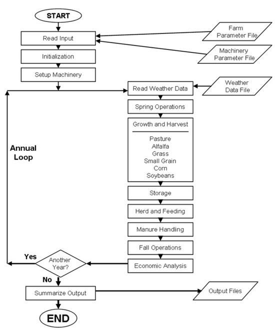 Figure 3 illustrates the algorithm of the IFSM 4.7. The model starts by integrating farm and machinery file input data depending on farm type and the size of the operation. Next, weather input data are incorporated based on farm location. From there, farm-specific inputs are entered regarding production levels and management practices. Once all input data for a given year have been entered, additional operating years may be entered. If no other data are needed, the model simulates farm results and summarizes data based on the information entered into the model.