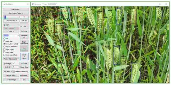 In the annotation process of the wheat ear video dataset, we utilized DarkLabel version 2.4 []. A total of 8858 frames from the video sequences were annotated. Starting from frame 0, wheat ear images were marked with rectangular bounding boxes frame by frame. These manually annotated real target positions and trajectory information help us to evaluate the model’s performance in practical applications. The annotation results are shown in Figure 3.