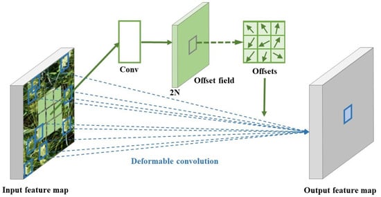 Throughout the growth stages, wheat ears can exhibit diverse shapes, colors, and densities due to different growth factors. Furthermore, during UAV flights, camera motion may distort wheat ear images. The factors mentioned above can easily cause errors in wheat ear detection models. Models should adapt to changing feature distributions. Traditional convolutions ignore target deformation and position, yielding poor results for uneven features. Thus, this study introduces Deformable ConvNets v2 (DCNv2), a neural network using offsets for deformable convolutions []. DCNv2 dynamically adjusts kernel positions to precisely address target changes. This adaptation empowers the feature layer to adjust the receptive field and scale, resulting in improved performance in detecting wheat ear targets of different characteristics.