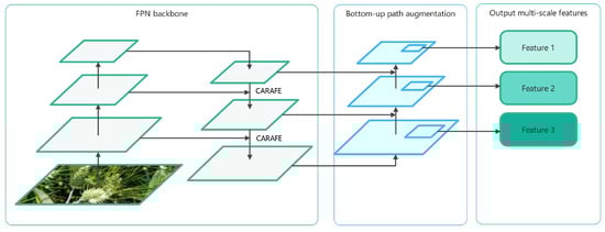 Conventional upsampling methods focus only on spatial distances among sub-pixel neighbors. However, in the task of wheat ears detection, due to the limited feature information that wheat ears can capture, this approach cannot fully grasp the hidden semantic information in the feature map. This may result in the loss of important details and contextual information. To address this issue, we introduce the lightweight upsampling operator CARAFE [] in PAN. During the upsampling process, CARAFE aggregates extensive contextual information, enabling PAN to better capture wheat ear details and context, thus reducing feature loss during upsampling. Figure 7 illustrates the structure of CARAFE-PAN.