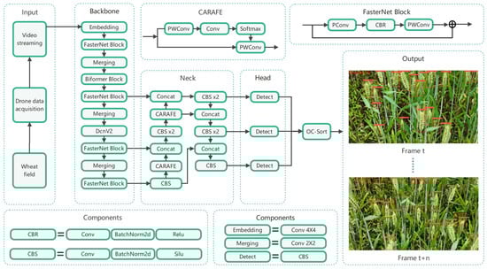 As depicted in Figure 9, the Wheat-FasterYOLO framework incorporates FasterNet with DCNv2 and BiFormer in its backbone. Employing PAN with CARAFE in the network’s neck and three YOLO heads in the head predicts wheat ear target regression. OC-SORT enables efficient real-time tracking and updates of wheat ear positions, enabling real-time wheat ear tracking and counting.