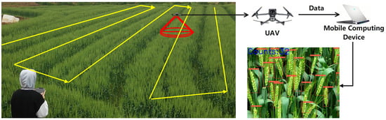 In our research, the process of using a model for actual counting is illustrated in Figure 10. First, based on the features of the actual wheat field, manual route planning for the drone’s flight path is conducted to ensure that every area is scanned by the drone. Subsequently, the automatic cruise function is initiated, and the drone will autonomously fly and capture a sequence of wheat ear videos based on the previously established flight route. Finally, when the drone begins its operation, real-time captured video data are transmitted to our mobile computing device terminal through DJI’s OcuSync transmission technology. Running our models on mobile devices with the PyTorch deep learning framework, real-time detection and counting of the wheat ear video sequence are performed, providing real-time counting results.