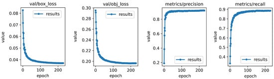 During training, we employed common object detection techniques like mosaic data augmentation, cosine learning rate scheduling, and hyperparameter evolution. Figure 11 visualizes bounding box regression loss, confidence loss, precision, and recall for the Wheat-FasterYOLO model’s validation set.