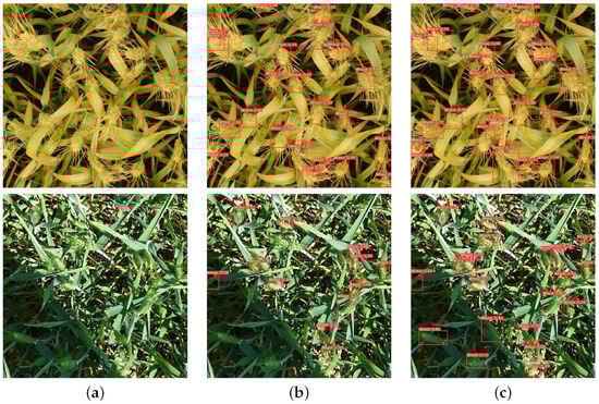 Wheat is one of the world’s primary staple crops, playing a crucial role in meeting global food demands. Its production and quality control are critical factors in ensuring global food security [], with the wheat ear as the reproductive organ of the wheat plant, directly influencing both the yield and quality of wheat []. Research indicates that the number of ears per unit area is the dominant yield component, and negative correlations were obtained between most of the parameters affecting the yield per plant and the yield per unit area []. Plant breeding experts utilize the information on wheat ear quantities from different varieties, combining these data with genetic and environmental factors. Through hybridization experiments involving a large number of wheat varieties, they select strains suited to various growing conditions, developing more resistant and higher-yielding varieties []. Effective detection and counting of wheat ears are essential for wheat yield prediction and ensuring food security []. Therefore, building a fast and efficient automatic counting method for wheat ears is of great significance, and wheat ear detection technology enables precise assessment of wheat ear quantities in fields, providing vital support for agricultural production, field management, and food trade [].