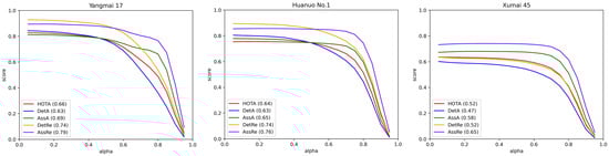 In summary, the Wheat-FasterYOLO model proposed in this paper, when integrated with the OC-SORT algorithm, achieved higher HOTA and overall performance compared to ByteTrack and StrongSORT. It achieved an average FPS of 92, meeting the requirements of real-time wheat ear tracking and counting. Figure 14 shows the HOTA, DetA, AssA, DetRe, and AssRe curves of OC-SORT at different association accuracy threshold values “alpha”, reflecting the variations in scores of various metrics with the threshold “alpha”.