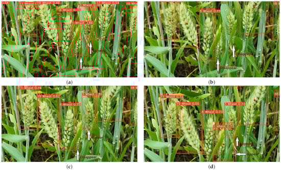 When collecting data with UAV, wheat ear targets are prone to temporary loss in the detector due to motion blur or occlusion. However, by integrating target-tracking algorithms, as long as the wheat ear target is detected once in the video sequence, a unique ID can be assigned and counted. In subsequent detections, if the detector redetects the lost target and the target has not undergone significant irregular motion or severe deformation, the tracking algorithm will ensure consistent ID recognition. Wheat-FasterYOLO avoids the issue of the same target being counted repeatedly in different video sequences, as shown in Figure 15 for a specific illustration.