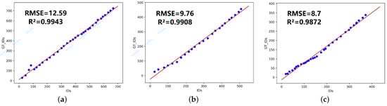 Table 8 shows the counting results for three different types of wheat ears. In the table, “IDs” represent the model’s counting results, “GT_IDs” represent the actual number of wheat ears, and “Counting accuracy” reflects the accuracy of the model in practical wheat ear counting tasks. As shown in Figure 16, a linear regression analysis is performed between the model count results and the actual quantity over a period of time. R reflects the degree of agreement between the model count values and the actual values. The closer its value is to 1, the better the fit. RMSE represents the deviation between the calculated value of the model and the actual value. It can be seen from this that there is a strong correlation between the counting results of the wheat ear counting method proposed in this study and the manual counting results, indicating that our method is practical.
