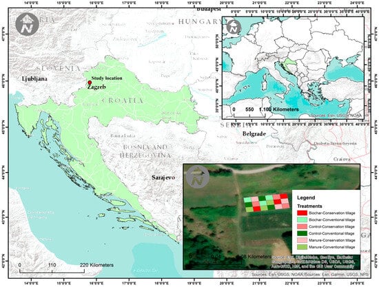 Primary tillage (plowing and loosening) for maize was implemented during November in the previous autumn, and supplementary tillage followed in April before planting. Between-row cultivation measure was not performed during the research period. In each tillage treatment, three sub-treatments (8 m wide and 6 m long) (Figure 1) were established: without any addition—control, biochar, derived from wood, with a dose of 40 t ha−1, and the addition of cattle manure (40 t ha−1). Biochar and manure were added only during primary tillage performed in November 2020. Their basic properties are presented in Table 2.