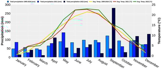 The study area is located in northwestern Croatia (45°55′ N; 15°44′ E; elevation—211 m above sea level) in the village of Marija Magdalena (Figure 1). It is predominantly a hilly area, and land besides natural forests is covered mainly by croplands and orchards. The slope inclination in the study area is 11°. The climate of the study area is temperate continental. The mean annual temperature is 11.2 °C, and the total average precipitation is 970 mm. The studied years (2021 and 2022) are similar to the average 1995–2020 (Figure 2). The study area’s soil is classified as Stagnosols [32] loam in topsoil and clay loam in subsoil (Figure 1). The general properties are shown in Table 1.
