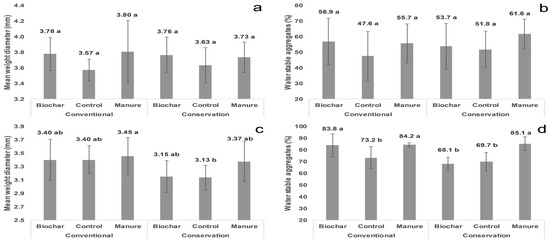 Effect of tillage and amendments treatments on (a) mean weight diameter in 2021, (b) water-stable aggregates in 2021, (c) mean weight diameter in 2022, and (d) water-stable aggregates in 2022. Different letters represent significant differences at p < 0.05. Hanging bars represent standard deviation.