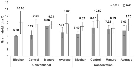 The yields are presented in t ha−1 at 14% moisture content. In 2021, the highest maize yield was detected in conventional tilled manure plots (8.86 t ha−1), followed by conservation control plots (8.47 t ha−1) (Figure 4). The lowest was noted at conventionally tilled biochar plots (5.98 t ha−1). Comparing the tillage effect, the maize grain yields did not significantly differ. Conventional tillage recorded 7.04 t ha−1 and 7.63 t ha−1 at conservation tillage. In 2022, conservation-tilled control and conventional-tilled biochar reached the highest yield (10.50 t ha−1; 10.08 t ha−1), followed by conventional-tilled control (9.54 t ha−1) and manure plots (9.24 t ha−1). The lowest yields were noted at conservation manure plots (8.29 t ha−1). The tillage effect was not significant. Conservation tillage plots (9.20 t ha−1) recorded lower yields than conventional (9.62 t ha−1).