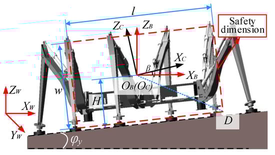To ensure that the torso is not interfered with by the terrain, point D must remain above the slope throughout the motion. The torso attitude angle and geometric constraints facilitated the determination of the coordinates of point D relative to the reference coordinate system OW-XWYWZW.