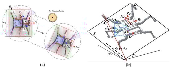 As shown in Figure 4b, the center-of-mass location in the reference coordinate system is denoted by BOG (BxG, ByG, BzG). The adjacent foot-end points of the robot for leg-end positions leg1 and leg3 are denoted as A1 (Bx13, By13, Bz13) and A3 (Bx33, By33, Bz33), respectively. The point SOG is the projection of the center-of-mass on the slope surface S, and BOG forms a vertical line with Line A1A3. The intersection point of BOG and the vertical line is N (BxN, ByN, BzN). Point BOGh is the highest point that BOG can reach by rotating around the support edge A1A3. The angle between BOGh and the horizontal plane is denoted as θ. The angle between the support boundary c and the horizontal plane is denoted as α, and M is the intersection point of the perpendicular line from the center-of-mass BOG to the straight line BOGhN.