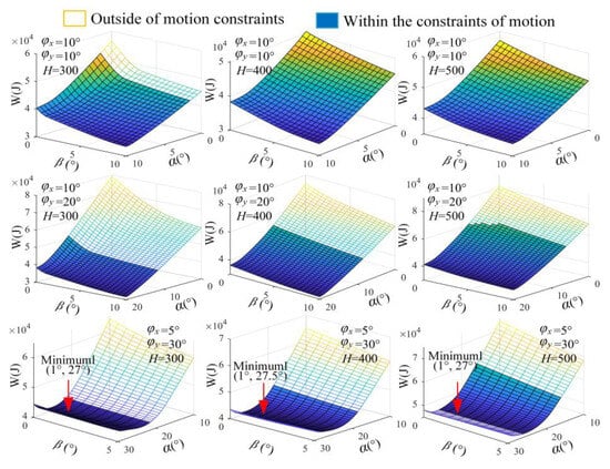 As the center-to-ground height of the torso form increased, the energy consumption initially decreased and then increased. This is because the maximum force of the hydraulic system decreased and then increased with the variations in height H. Moreover, as height H increased, the range of available torso-pitch and roll angles also increased, which were constrained by the torso safety zone size and drive hydraulic-cylinder position limits. When the terrain slope increased, the stability constraint became dominant, restricting the torso’s attitude and reducing the range of selectable attitudes.