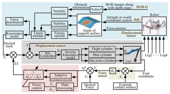 A force–position composite control was employed to maintain body-posture stability during motion. The control method for the leg is the integration of an outer-loop adaptive fuzzy impedance algorithm with an inner-loop position control. The impedance controller generates the position correction ΔX based on the difference ΔF between the contact force F and the desired force Fr, and the motion position Xr is subsequently adjusted with the position correction ΔX. This enables the six-legged robot to maintain its body posture on a complex terrain by tracking the force.