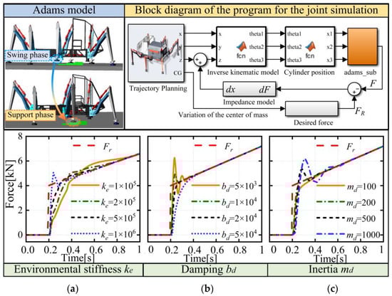 Figure 8 depicts the joint simulation system constructed using MATLAB/Simulink and Adams to analyze the influence of md, bd, and ke on the control performance of the system. Figure 8c shows that as the target impedance inertia parameter md decreases, the response speed increases, while the regulation time and overshoot decrease. However, when the overshoot approaches a zero value, md decreases again, leading to a decrease in the response speed and an increase in the time required to reach a steady state. Figure 8b indicates that increasing bd results in a decrease in the response speed and regulation time, whereas the absence of an overshoot leads to a decline in the response speed. However, when an overshoot is absent, increasing bd leads to a decrease in the response speed. Figure 8a reveals that changes in the environmental stiffness parameters result in significant variations in the force-tracking performance. Therefore, we proposed a real-time self-adaptive fuzzy algorithm to adjust the impedance model parameters based on the error information determined between the expected and actual contact forces. This approach enhances the force-tracking performance of the impedance controller under different environmental parameters, thereby improving the adaptability of a six-legged robot to its surroundings.