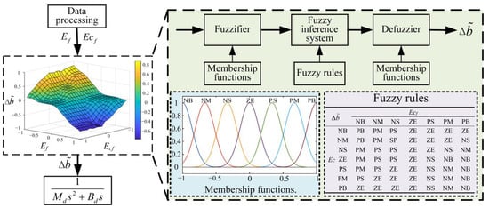 The fuzzy inference process, as shown in Figure 9, involves dividing the various input and output quantities of the fuzzy controller into seven fuzzy levels [NB, NM, NS, ZE, PS, PM, PB], which increase in order from NB to PB. The Gaussian-type subordination function was selected as the subordination function. The fuzzy control rules and image of the affiliation function for the target damping parameter adjustment were established according to the principle of target damping parameter adjustment. The parallel method was used for fuzzy inference, and the center-of-gravity method was used for defuzzification. The increment of the normalized target damping parameter was obtained.