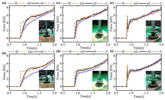 Performance of force tracking for different environmental stiffnesses. (a) Slope force tracking in soft soil terrain. (b) Slope force tracking in soft foam terrain. (c) Slope force tracking in hard terrain. (d) Acceleration force tracking in soft soil terrain. (e) Acceleration force tracking in soft foam terrain. (f) Acceleration force tracking in hard terrain.