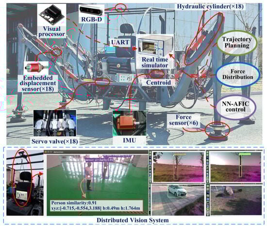 The experimental platform utilized for the study of the six-legged robot discussed in this study is depicted in Figure 11. The hexapod had a total mass of 3.55 metric tons, with an electrohydraulic servo mechanism based on hydraulic propulsion. Once the desired trajectory was established, the corresponding current value was input to the servo valve to regulate the movement of the hydraulic cylinder associated with the valve, which was equipped with a built-in displacement sensor to provide feedback regarding its position. A hydraulic pump supplied by Danfoss offered a maximum output pressure of 31 MPa.