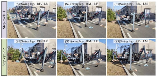 First, the effect of the force–position composite control algorithm on the posture of the torso during motion was compared. The experimental scenario is shown in Figure 12. The full cycle consisted of three steps, with two legs for swing in each step and the remaining four legs for support. This gait style is more suitable for complex terrain, because it has higher stability than three-legged support. The base junction foot-end phase began at an initial height of −0.4 m, and the motion step length was 0.8 m. Each step took 3 s, with a 0.3 m lift in the z-direction when swinging. The motion trajectory of the robot used a low-impact foot-end trajectory method that facilitated the initial position and velocity constraints by employing acceleration as a sinusoidal function.