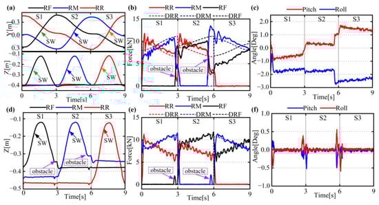 The trajectory of the leg on one side of the hexapod robot during position-based control relative to its initial stance in the forward Y-direction and vertical Z-direction is shown in Figure 13a. Each side of the robot has two support-legs and one swing-leg involved in each gait cycle, and the force on each leg is shown in Figure 13b, where the right front (RF) leg and right middle (RM) leg step on the obstacle at 2.73 s and 5.45 s, respectively. The larger force generated when the obstacle is stepped on also affects the forces on the other legs, which has a greater impact on the torso stance of the body. During the support process, owing to the uncertainty of the terrain, the position of the center-of-mass changes accordingly at different slopes, leading to a large deviation in the force of each leg from the expected force, when the posture of the robot torso is influenced by the environment. The robot’s torso posture is shown in Figure 13c, and due to the irregular terrain of the landing point, the robot’s roll and pitch angles have undergone significant changes. Figure 13d,e show the z-direction coordinates of the legs in the force–position control situation and the forces acting on the legs; it can be seen that when the obstacles are encountered during the swing phase at 2.65 s and 5.68 s, the sensor detects the changes in force and avoids the obstacles by adjusting the displacement in the z-direction, which is adjusted to avoid the movement of the entire vehicle. In the support phase, the change in the displacement in the z-direction is adjusted according to the change in the support force, thus ensuring that the desired force of the leg to the torso support agrees better, and that the foot-end force can fluctuate around the desired force to achieve dynamic equilibrium. The posture of the robot’s trunk is shown in Figure 13f, and it can be seen that the robot can maintain stability of the trunk after a brief adjustment during phase switching. This indicates that the control method proposed in this article can enable the robot to maintain the target attitude while moving in complex terrain.