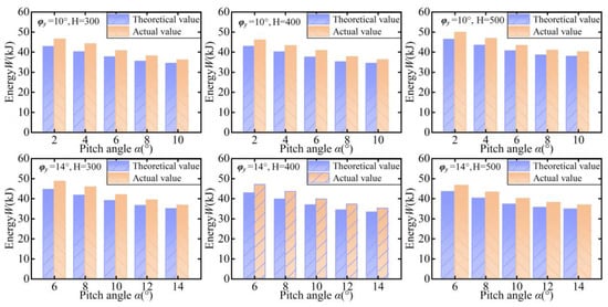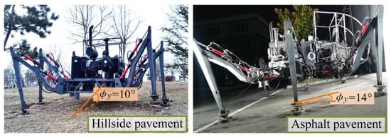 To validate the posture optimization method adapted for various terrains, experiments were conducted using two types of terrains: the hillside, with a pitch angle of 10°, and asphalt pavements which had a pitch angle of 14°, as shown in Figure 14. Experiments were conducted with the hexapod robot walking on a slope at different trunk center-of-mass heights (H) and trunk pitch angles (φy). The robot’s total energy consumption for each stride was determined through the pressure and flow of the hydraulic system. The system’s working pressure was obtained through a pressure sensor, and the working flow was calculated based on the cylinder displacement. As shown in Figure 15, it can be observed that under two slope conditions, the energy consumption of the hexapod robot with the growth of H exhibits a trend of initially decreasing and then increasing. Moreover, as the trunk pitch angle increases, the energy consumption gradually decreases. At a terrain pitch angle of φy = 10° and a trunk center-of-mass height of H = 400 mm, the minimum energy consumption occurred when the trunk pitch angle was at 10°. The theoretically calculated result was 34.2 kJ, while the experimental result was 36.1 kJ. When the estimated slope was at a pitch angle of φy = 14°, the minimum energy consumption of the hexapod robot occurred at a trunk center-of-mass height of H = 400 mm and a trunk pitch angle of 14°. The theoretical result was 33.1 kJ, and the experimental result was 35.0 kJ. The actual energy consumption of the robot hydraulic system in each step is shown in Table 3. These results indicate a certain discrepancy between the theoretically calculated energy consumption and the actual values. This discrepancy is due to additional energy consumption caused by pressure shocks and position errors during the actual motion process. However, the trend of energy consumption changes with posture being observed in actual walking is consistent with the theoretically calculated energy consumption, thereby validating the effectiveness of the posture optimization strategy proposed in this study.