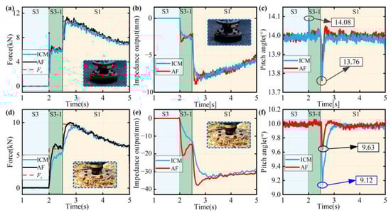 The performance of legged robots is significantly affected on hillside terrain, where the ground stiffness is low. The experimental results depicted in Figure 16d show that, during the transition phase, the ICM is more sensitive to the environment, causing a slower response while tracking the constant force and resulting in force-tracking errors of constant-force tracking during the gait time. In the support phase, the traditional impedance method establishes the target support force in 0.43 s, while the AF control algorithm proposed in this study establishes the target support force in 0.16 s. Both control algorithms exhibit improved desired force-tracking effects, because the robot compressed the soil during the motion, owing to self-weight. This improved the terrain stiffness, particularly by adding a transition phase, thereby reducing the steady-state error. As shown in Figure 16f, in the low-stiffness environments and during phase switching, the maximum tilt angle of the body is 0.37°, whereas the maximum tilt angle of the impedance control is 0.88°. Because of the small compensation amount of the ICM during phase switching, the body experienced a brief tilt instability caused by the low stiffness of the ground, thereby failing to establish support in time.
