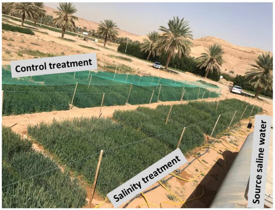 Currently, numerous environmental stresses present a substantial threat to global food security. On the other hand, global food production needs to be increased by about 70% to ensure food security for the projected population of 9.7 billion people by 2050 [1]. Although the annual increase of 1.0–1.6% in the production of most major food crops, such as wheat, rice, and maize, the impact of environmental stresses on grain yield (GY) surpasses this growth rate. This situation will intensify the pressure on global food security in the coming years [2]. Salinity is widely recognized as one of the most prominent of these environmental stresses that greatly reduces GY for most food crops in many parts of the world. Under moderate salinity stress (40–80 mM NaCl), the average GY of most major food crops may be globally reduced by over 50% [3,4,5]. Statistically, salinity stress currently affects about 20% of cultivated areas. Furthermore, it is projected to reach 50% or more by 2050, as approximately 1.5 million hectares of cultivated land are salinized annually due to both natural and human factors. In addition, salinity stress significantly restricts the productivity of approximately 33% of irrigated lands, which are responsible for producing around one-third of the world’s food supply [4,6]. Moreover, there is a loss of over USD 13 billion annually due to irrigation-induced salinity alone [7]. All these facts about salinity may explain why there is a close association between food crises and salinity issues in the agricultural sector, particularly in arid and semiarid countries.