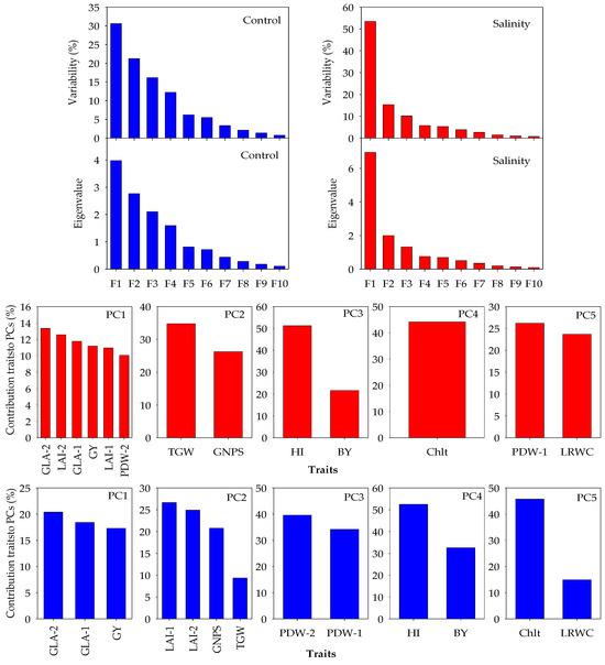 Eigenvalue and variability percentage of the first ten principal components (PCs) and contribution of the traits to first five PCs under control and salinity conditions. Abbreviations of PDW, GLA, LAI, LRWC, Chlt, GNPS, TGW, BY, GY, and HI are plant dry weight (g plant−1), green leaf area (cm2 plant−1), leaf area index, leaf relative water content (%), total chlorophyll content (mg g−1 FW), grain number per spike, thousand-grain weight (g), biological yield (ton ha−1), grain yield (ton ha−1), and harvest index (%), respectively. Values 1 and 2 represent measurements at 70 and 90 days after sowing, respectively.