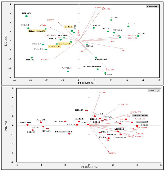 Under salinity conditions, the two salt-tolerant genotypes Sakha 93 and Kharachia-65 were grouped together with RILs 2, 6, and 8 and situated along the positive region of PC1 and PC2. These genotypes showed a strong correlation with PDW at 70 and 90 DAS, GLA at 70 DAS, Chlt, and BY (Figure 3). Gemeza 9, Kawz, Misr 1, and RILs 2, 6, and 8 were located in the positive region of PC1 and the negative region of PC2. They were closely correlated with the remaining traits. Salt-sensitive genotype Sakha 61, Sids 1, Shendaweel-1, and RILs 1, 9, 10, 11, 13, 14, 15, and 16 leaned towards the negative region of PC1 and positive or negative region of PC2. These genotypes did not show any relationship with morpho-physiological traits (Figure 3).