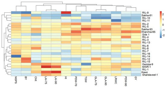 The relative changes in each agro-morpho-physiological trait for every genotype are presented in Table 4. These changes indicate the percentage reduction of each trait under high salinity levels compared to the control treatment. The different color shades in Table 4 represent the range of reduction percentages. The color gradient, ranging from dark blue to dark orange, reflects the gradient in reduction percentages of the trait from the minimum to the maximum. Generally, there was a wide range in the reduction percentages for all agro-morpho-physiological traits, except for LRWC, GNPS, and TGW, which exhibited a narrow range. The reduction percentages ranged from 8.7% to 39.2%, 14.5% to 44.0%, and 3.7% to 54.3% for PDW, GLA, and LAI at 70 DAS; 15.5% to 49.5%, 15.3% to 46.5%, and 10.0% to 55.2% for PDW, GLA, and LAI at 90 DAS; and 4.8% to 22.0%, 9.9% to 56.1%, 2.9% to 23.3%, 5.6% to 52.8%, 19.5% to 49.1%, and −24.8% to 37.2% for LRWC, Chlt, GNPS, TGW, BY, GY, and HI, respectively (Table 4). Additionally, the salt-tolerant genotypes Sakha 93 and Kharachia-65 exhibited the lowest reduction percentages for most agro-morpho-physiological traits, while the salt-sensitive genotypes Sakha 61 and Shandaweel-1 displayed the highest reduction percentages. Among the RILs, three out of eleven (RIL9, RIL10, and RIL11) from the crossing between Sakha 93 and Sakha 61 and all RILs (RIL12–RIL16) from the crossing between Sakha 93 and Sids1 had the highest reduction percentages for most agro-morpho-physiological traits. Conversely, the remaining RILs from the crossing between Sakha 93 and Sakha 61 (RIL1–RIL8) showed the opposite trend (Table 4). Kawz and Misr-1 exhibited the lowest reduction percentage in LAI at 70 and 90 DAS (3.7–14.5%). In contrast, the reduction percentage for this trait surpassed 30% in the majority of RILs and genotypes. The minimum reduction percentage in PDW and GLA at 70 and 90 DAS was observed in Sakha 93 and Kharachia-65. Although RIL12 and RIL15 had the lowest reduction percentage in BY (5.6% and 4.1%), they had an adequate reduction percentage in GY (31.4% and 24.5%) and HI (27.3% and 18.6%). Seven genotypes (Sids-1, Kharachia-65, Gemiza-9, RIL2, RIL5, RIL9, and RIL13) exhibited an increase in HI under salinity conditions compared to the control (Table 3). Consequently, the reduction percentages of HI in these genotypes were negative (Table 4).