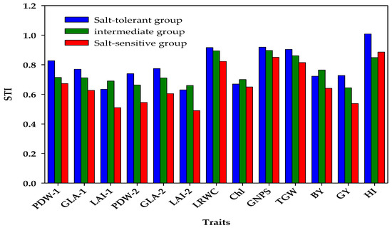 Salt tolerance index (STI) of measured traits for salt-tolerant (T), intermediate (I), and salt-sensitive (S) genotypes groups. Abbreviations of PDW, GLA, LAI, LRWC, Chlt, GNPS, TGW, BY, GY, and HI are plant dry weight (g plant−1), green leaf area (cm2 plant−1), leaf area index, leaf relative water content (%), total chlorophyll content (mg g-1 FW), grain number per spike, thousand-grain weight (g), biological yield (ton ha−1), grain yield (ton ha−1), and harvest index (%), respectively. Values 1 and 2 represent measurements at 70 and 90 days after sowing, respectively.