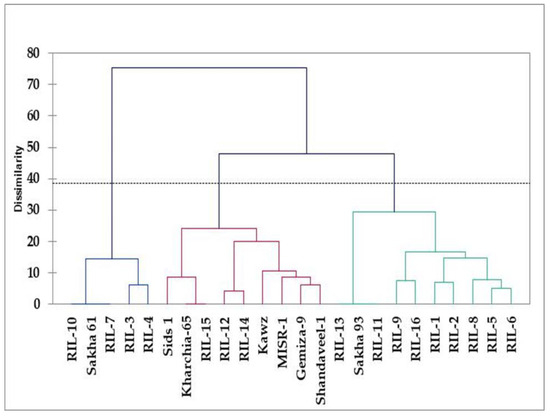The 24 genotypes/RILs were divided into three distinct clusters based on the allelic data of 40 SSRs linked to salt-tolerant genes (Figure 6). In general, the SSR data separated the salt-sensitive check genotype Sakha 61 from the two salt-tolerant check genotypes Sakha 93 and Kharachia-65. Cluster 1 included two, two, and one genotype(s)/RIL(s) from the S, T, and I groups, respectively. Cluster 2 included two, three, and four genotypes/RILs from the S, T, and I groups, respectively. Cluster 3 did not include any genotypes/RILs from the S group, while it included three and seven genotypes/RILs from the T and I groups, respectively (Figure 4).