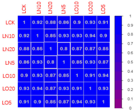 The soluble protein content in plants is often considered as a crucial indicator of plant oxidative senescence. A significant portion of the soluble protein found in mature plant leaves is ribulose diphosphate carboxylase (RuBPCase), which indirectly regulates RuBPCase levels, thereby enhancing photosynthetic capacity during the later stages of growth and effectively delaying crop senescence. As shown in Table 4, treatment with LO5, LO10, and LO20 resulted in increases of 17.51%, 22.46%, and 60.93%, respectively, in soluble protein content, with LO20 exhibiting the highest value at a statistically significant level. The increased soluble protein content also provided ample nitrogen sources for antioxidant enzyme synthesis, thereby enhancing the plant’s ability to scavenge reactive oxygen species and delay leaf senescence while increasing the yield potential. In the LN5, LN10, and LN20 treatment groups, there was an initial increase followed by a subsequent decrease observed in the soluble protein levels over time. The leaves treated with LN5 showed an increase of 11.06% in soluble protein content, while those treated with LN10 exhibited a substantial increase of 49.39%. Additionally, the LN10 treatment demonstrated the highest level of soluble protein content among all treatments with significant differences.