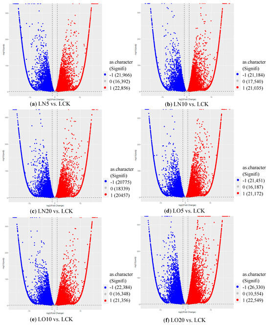 The image data of the sequenced fragments were converted into sequence data (reads) using CASAVA base recognition. Transcriptomic libraries were obtained for the control group (LCK), nano-selenium treatment groups (LN5, LN10, and LN20), and organic selenium treatment groups (LO5, LO10, and LO20). The sequencing error rate for all samples was less than 0.1%, indicating high-quality results (Table 5). These findings demonstrate that RNA-Seq exhibited excellent quality with randomized and evenly distributed clean reads. By comparing reads that matched unique transcripts, differential genes could be identified.