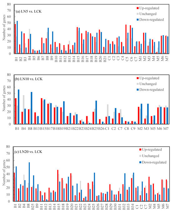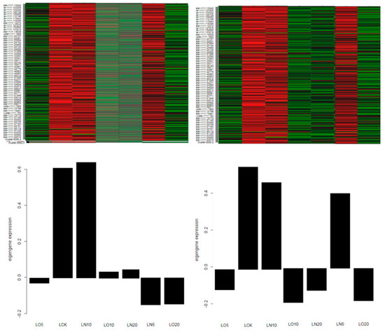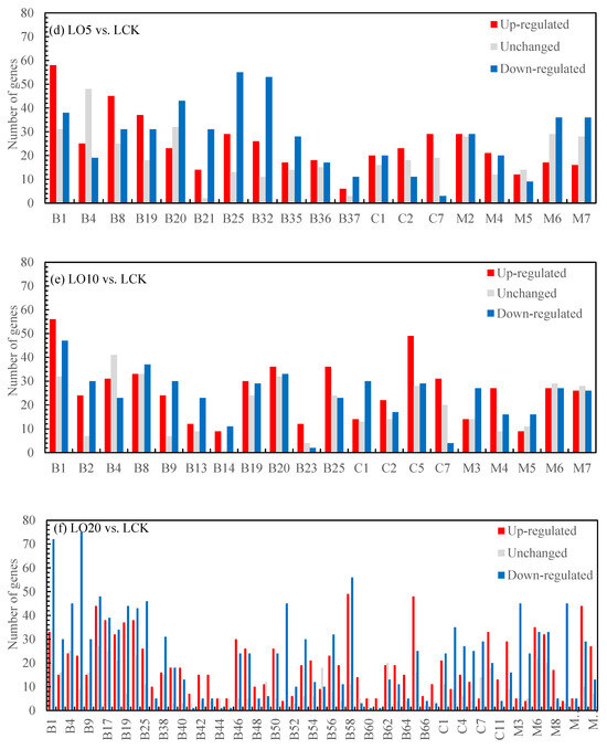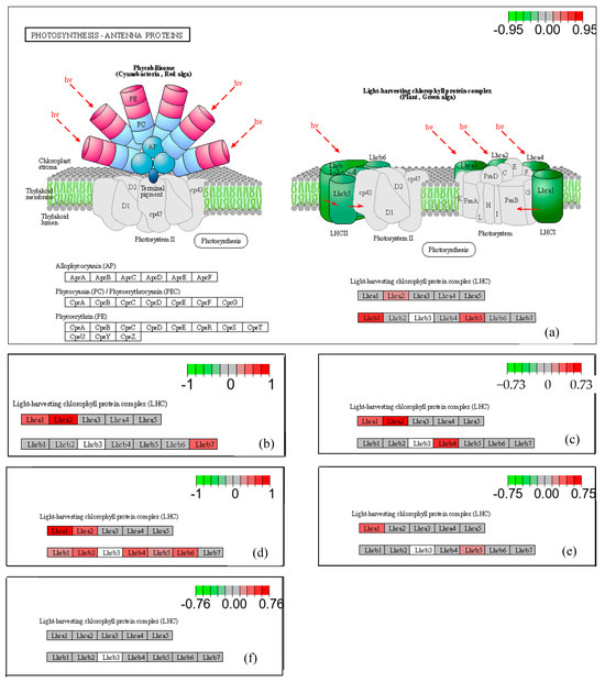 The expression of LHca2 (light-harvesting complex I chlorophyll a/b binding protein 2) was up-regulated in LN5 compared to LCK. Additionally, LHcb1 (light-harvesting complex II chlorophyll a/b binding protein 1) showed an increase in expression, as well as LHcb5 (light-harvesting complex II chlorophyll a/b binding protein 5). In LN10 vs. LCK, there was an up-regulation of LHca1 (light-harvesting complex I chlorophyll a/b binding protein 1), along with the up-regulation of LHca2 and LHcb7 (light-harvesting complex II chlorophyll a/b binding protein 7). Similarly, in LN20 vs. LCK, there was an up-regulation of LHca1, along with the up-regulation of LHca2 and LHcb4 (light-trapping complex II chlorophyll a/b binding protein). Furthermore, in LO5 vs. LCK, there was an up-regulation of LHca1. Specifically, there was an increase in the expression of chlorophyll a/b binding protein 2, also known as LHca2. Moreover, both LHcb1 and Lhcb2 were found to be up-regulated. Lastly, both LHcb4 and LHcb6 exhibited increased expression levels. LO10 vs. LCK specifically showed an increase in the expression level of LHca1 while also showing increased levels of LHcb5.