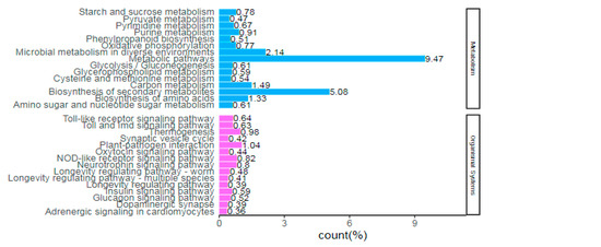 The pathway map illustrating the enrichment of differentially expressed genes is presented in Figure 5. To visualize the distribution of these genes within the pathway map, differential genes were annotated, with red indicating up-regulated genes and green representing down-regulated genes.
