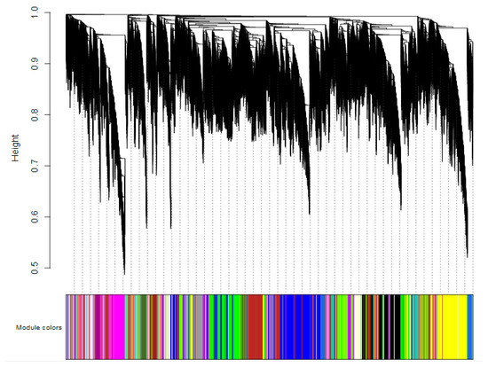 Hierarchical clusterting tree. Note: The color coding indicates that each gene in the clustering tree belongs to a specific module. A module is defined as a group of genes with similar expression changes during a physiological process. In the upper part of the tree, the vertical distance represents the genetic distance between two nodes.