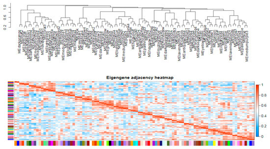 Module eigenegene correlation between different modules of WGCNA. Note: The correlation heat map between modules can be divided into two parts, with the upper part clustering modules according to their eigengene values. The ordinate represents the degree of dissimilarity of nodes; in the bottom half of the graph, each row and column represents a module. The darker (redder) the square color, the stronger the correlation; the lighter the square color, the weaker the correlation.
