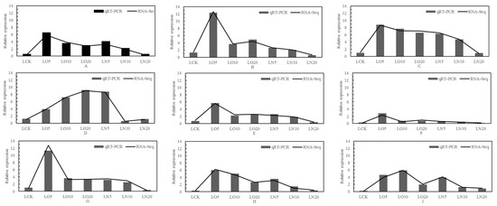 qRT-PCR identification and RNA-Seq analysis. Note: (A): LOC103857346, Actin-related protein 2/3 complex subunit 1A; (B): LOC103828797, Actin-related protein 2/3 complex subunit 2A; (C): LOC103874199, Superoxide dismutase [Fe] 3; (D): LOC103838242, Monodehydroascorbate reductase; (E): LOC103846588, Thioredoxin M2; (F): LOC103873206, ABC transporter A family member 7; (G): LOC106353797, ABC transporter B family member 26; (H): LOC103859979, ATP sulfurylase 1; (I): LOC103859070, Cysteine synthase D1.