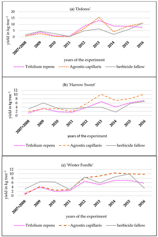 In the first 4 years of the presented experiment, the yield obtained from trees growing in LMs was up to two times lower than that of the control, regardless of the variety or type of mulch (Figure 1a–c). This trend was reversed in the 5-year-old orchard in the case of the ‘Dolores’ cv growing in Tr and lasted for the next 5 years, while in the grass mulch, a higher yield in this cultivar appeared a year later and persisted for another 4 years. In the ‘Harrow Sweet’ cv, only in the 6th year of the orchard’s operation did the presence of Ac mulch result in a higher yield, and this tendency continued until the end of the experiment. In the Tr variant, higher yields than the control (but lower than in the grass) appeared in a 7-year-old orchard of this cultivar, and this tendency turned out to be continuous. For the ‘Winter Forelle’ cv, only in the 7th year of the orchard’s operation were higher yields recorded in the variant with Ac mulch, and this tendency continued until the end of the experiment.